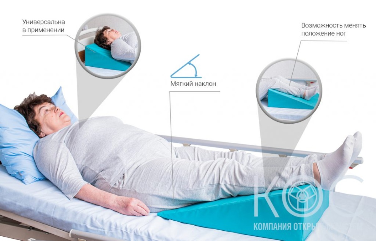 Универсальность использования. Такую подушку можно подложить острым углом под ягодицы пациента, так и под его пятки.