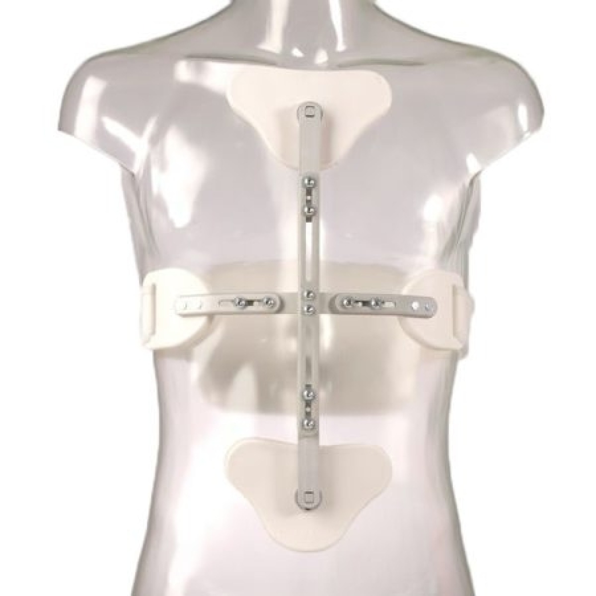 Выполнено данное изделие из специального алюминиевого сплава, обладает выраженной прочностью и легкостью. В точках фиксации ортеза имеются пластиковые опоры, покрытые вспененным полимером. Фиксируется изделие при помощи пояса и специальной застежки «велкро». Данное изделие предназначено для разгрузки передних отделов тел позвонков и препятствует сгибанию в грудном и поясничном отделах позвоночника. 2 верхние опорные точки размещаются под ключицам, 2 центральные опорные точки располагаются на блуждающих ребрах, нижняя опорная точка располагается в области лобковой кости. Размер данного корсета – универсальный. Индивидуальная подгонка изделия под пациента, осуществляется врачом посредством сдвигания или раздвигания опорных точек относительно центральной крестовины. Фиксация опорных точек к крестовине осуществляется 8 винтами.