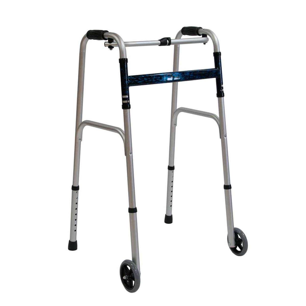 Опорные поручни ходунков выполнены из анодированного алюминия и не подвергаются коррозии, соединяющая рама – из стали с полимерным покрытием. Передние опоры оснащены колесами для облегчения передвижения и большей мобильности. Ходунки легко складываются и не занимают много места, имеют 8 положений регулировки высоты с шагом в 2,5 см. Мягкие накладки на поручнях ходунков не дают рукам скользить. Резиновые наконечники предохраняют от скольжения по твердым поверхностям.