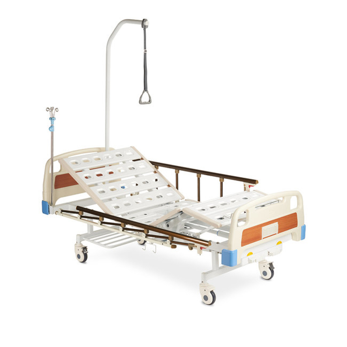 SAE-104-E – 4-секционная медицинская кровать с механическим приводом и возможностью регулировки спинной, тазобедренной и голеностопной секций. Модель оснащена съемной санитарной емкостью, под установку которой предусмотрено отверстие в тазобедренной секции.