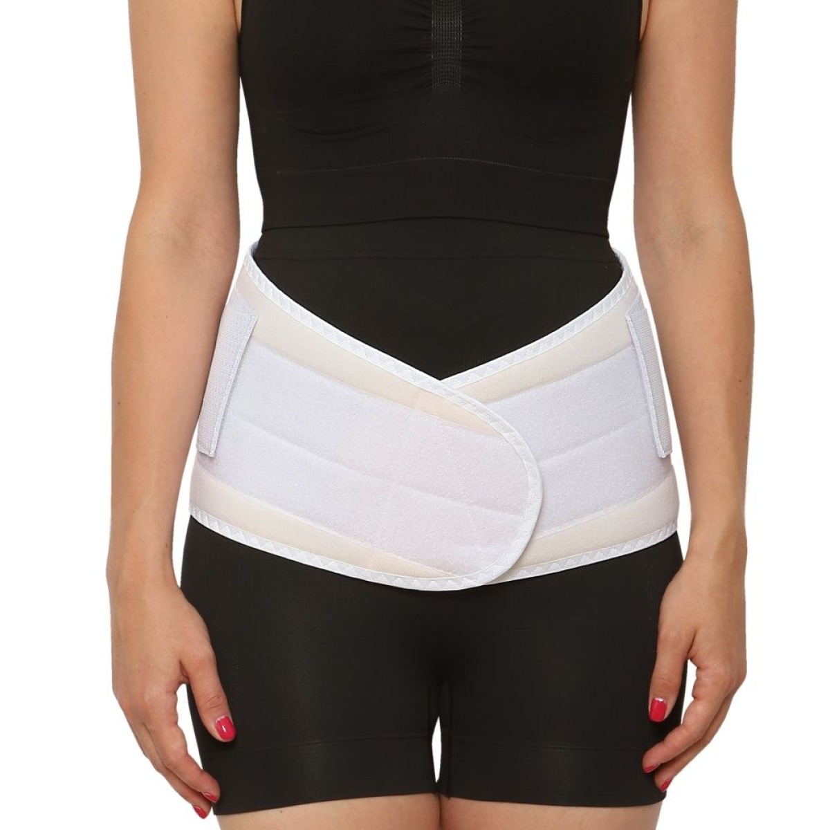 Обернуть бандаж вокруг тела и зафиксировать спереди с помощью застежки Velcro