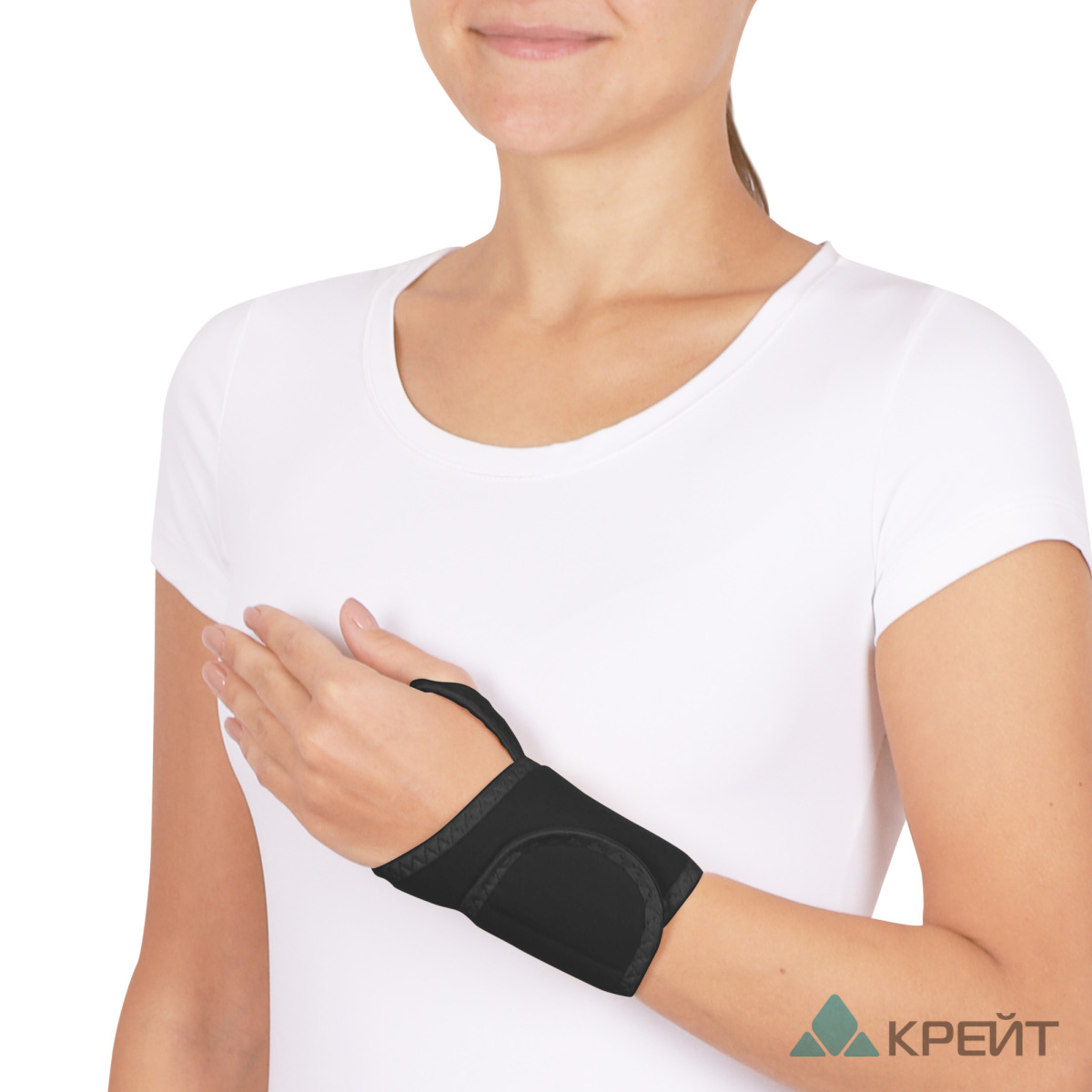 Разъемная конструкция с вырезом для фиксации большого пальца и лентой Velcro обеспечивает индивидуальную настройку обхвата запястья, позволяет легко надевать и снимать бандаж без посторонней помощи