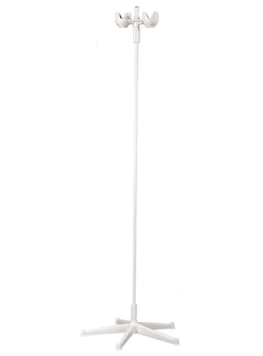 Штатив предназначен для размещения флаконов и одноразовых систем с лекарственными растворами, используемыми при проведении лечебных процедур Стойка — стальная тонкостенная труба с полимерно-порошковым покрытием Пятилучевое пластиковое основание Пластиковый держатель для 2-х флаконов с жидкостью, регулируемый по всей высоте стойки