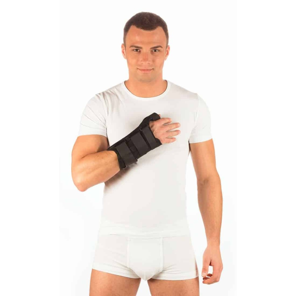 две узкие шины по тыльной поверхности предплечья и система лент с застежками «Велкро» плотно фиксируют запястье в функционально выгодном положении