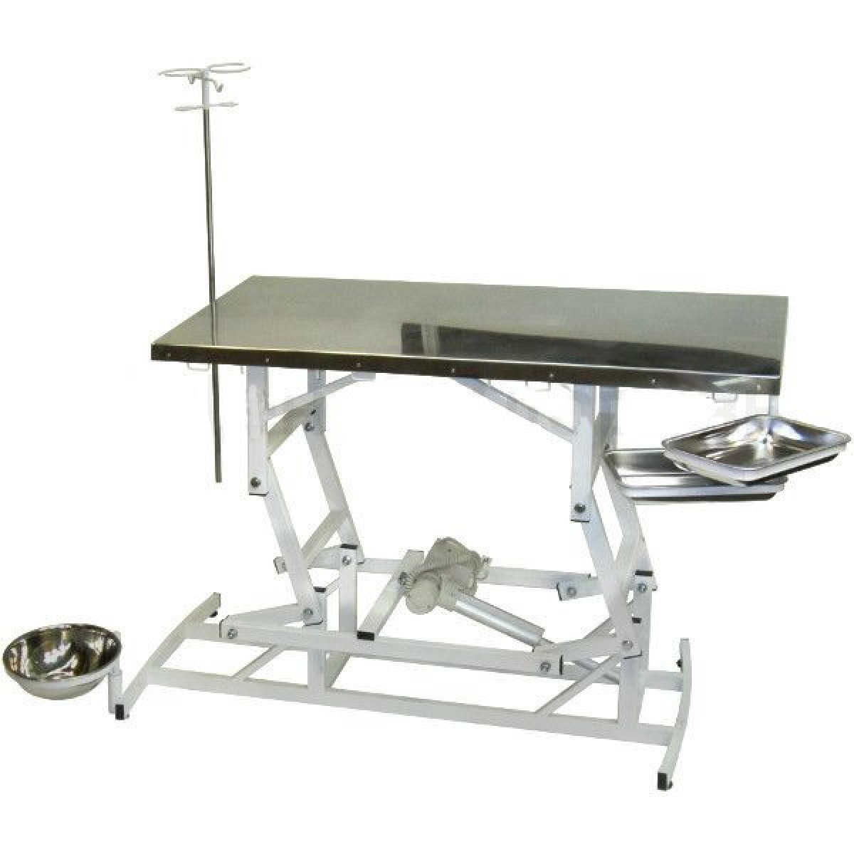 Ветеринарный стол полностью выполнен из стали. Каркас покрыт полимерно-порошковым покрытием белого цвета, столешница выполнена из нержавеющей стали.